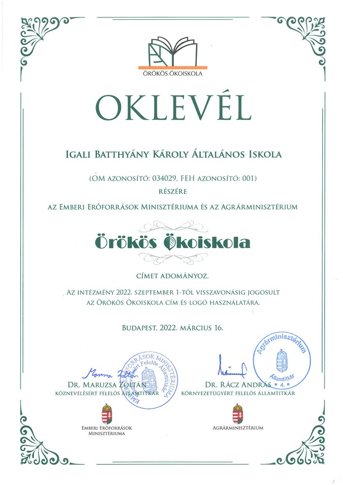 Iskolánk az előző tanévek során az Ökoiskola programban végzett eredményes munkájának köszönhetően elnyerte az Örökös Ökoiskola címet, melyet 2022. március 26-án veszünk át! Ezt az elismerést azok az iskolák vehetik át, amelyek folyamatosan és sikeresen valósítják meg a programban foglalt célokat és elvárásokat, például a környezettudatosságra és a fenntarthatóságra nevelést, valamint háromszor elnyerték az Ökoiskola címet.